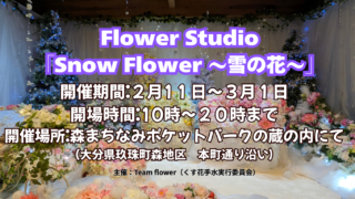 玖珠町 【玖珠町】Flower Studio「Snow Flower 〜雪の花〜」 Flower Studio「Snow Flower 〜雪の花〜」 開催期間:1月10日〜25日 開場時間:10時〜19時過ぎ頃まで 開催場所:森まちなみポケットパークの蔵内にて (大分県玖珠町森地区 本町... 2026.01.22 玖珠町玖珠町イベント